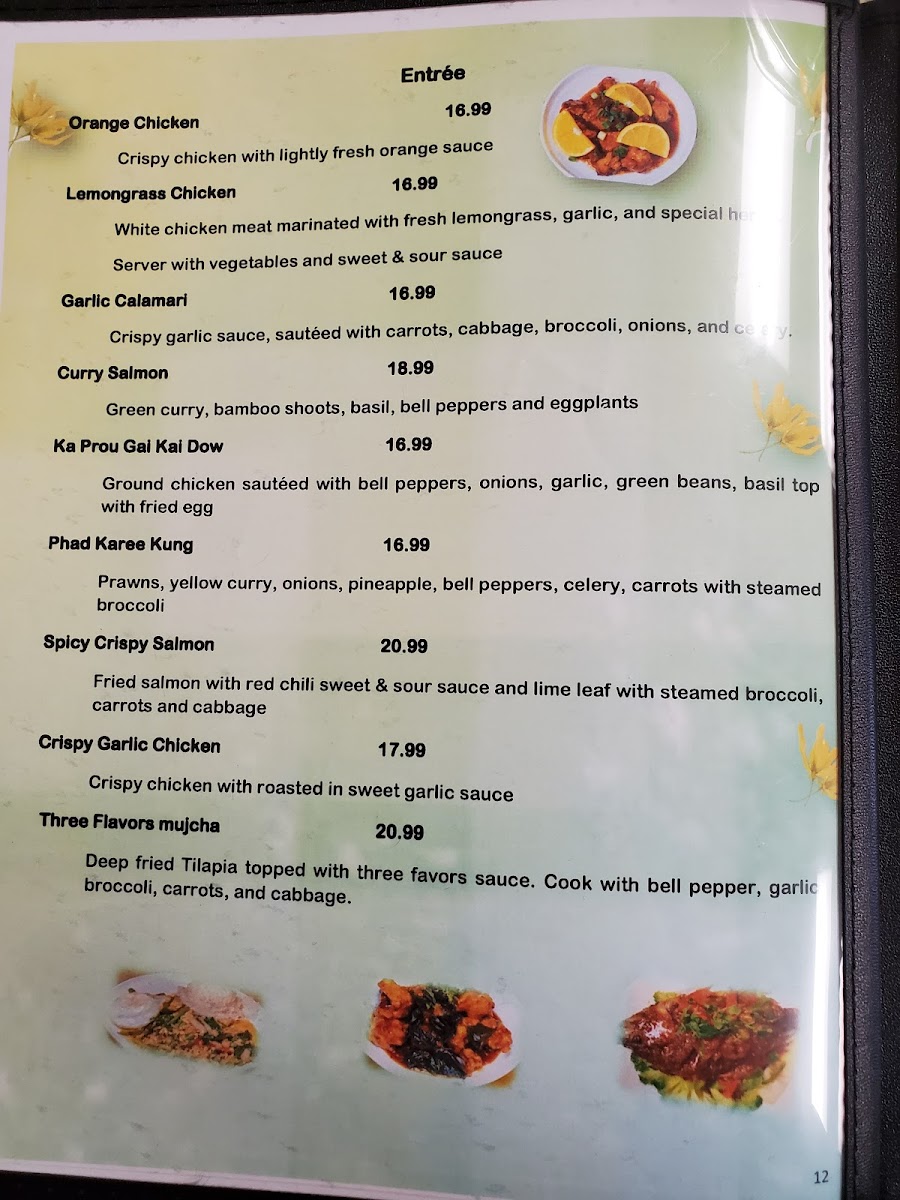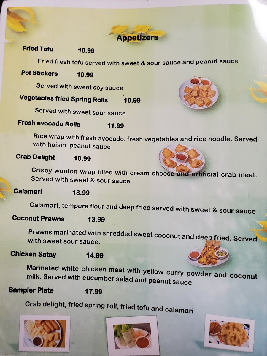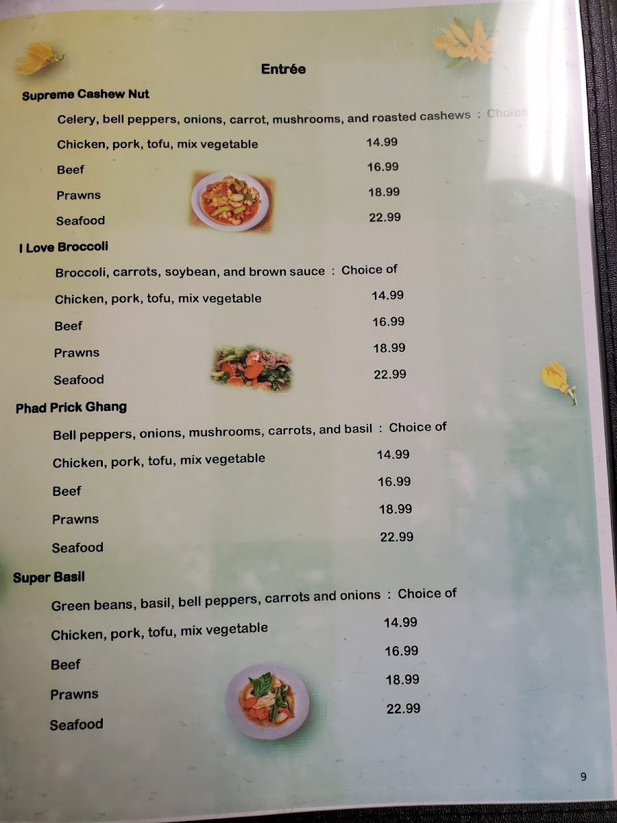 Green curry, fresh avocado, bamboo shoots, bell peppers, green beans and basil ( W/Beef 18.99, W/Prawn 20.99, W/Seafood 24.99 )