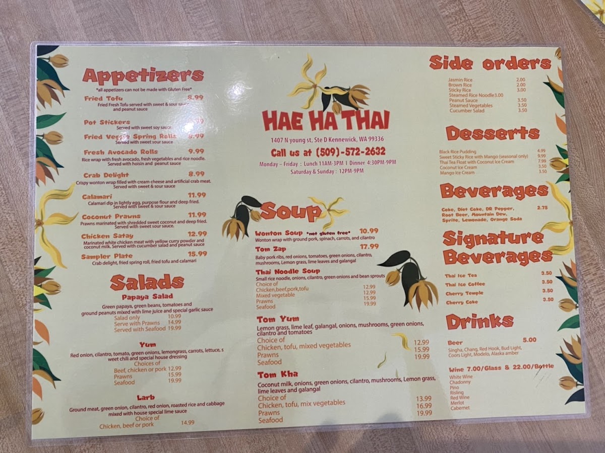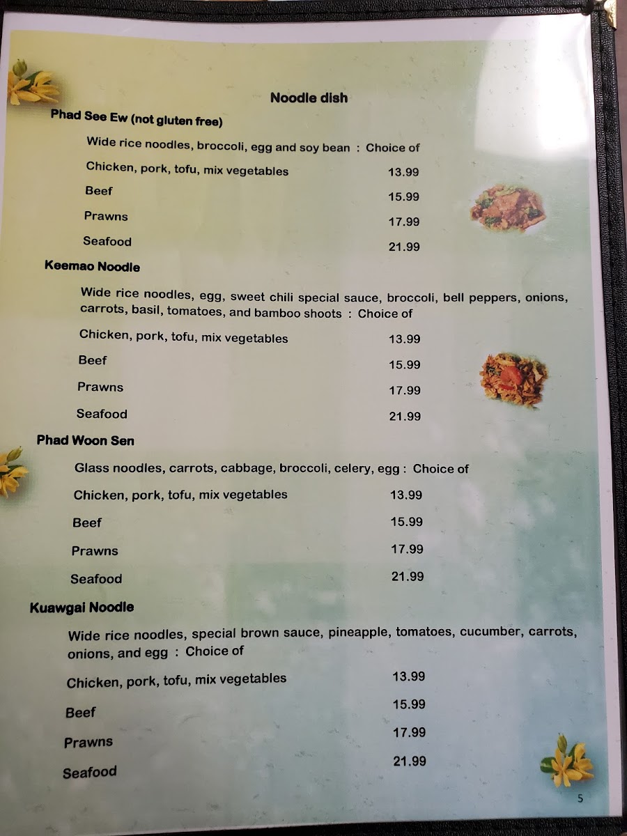 (not gluten free) Wide rice noodles, broccoli, egg and soy bean ( W/Beef 17.99, W/Prawn 19.99, W/Seafood 23.99