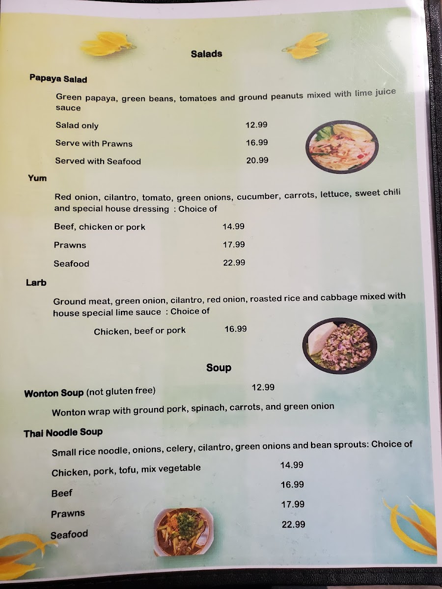Green papaya, green beans, tomatoes and ground peanuts mixed with lime juice and special garlic sauce ( W/Prawn 16.99, W/Seafood 20.99 )