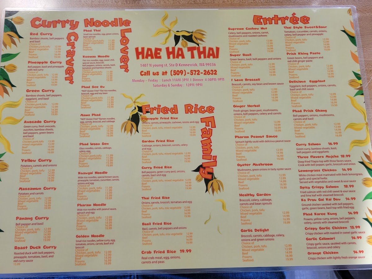 Wide rice noodles, special brown sauce, pineapple, tomatoes, cucumber, carrots, onions and egg ( W/Beef 17.99, W/Prawn 19.99, W/Seafood 23.99